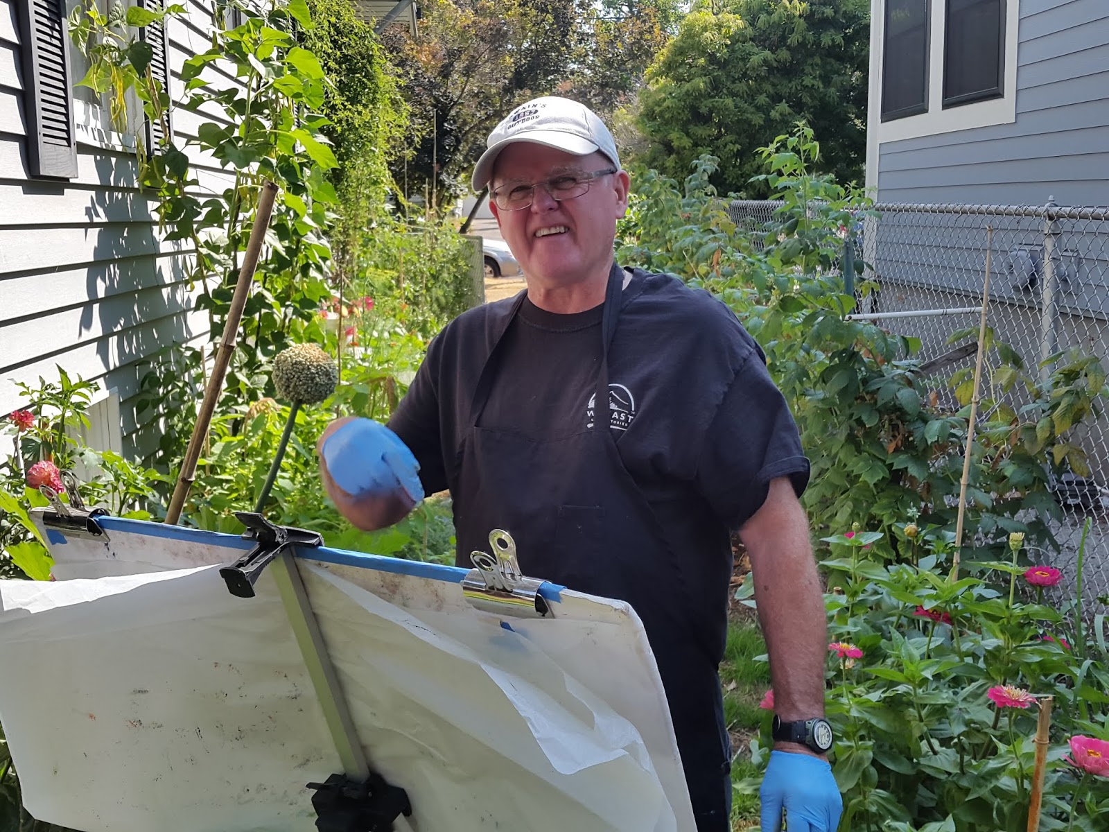 Painting Paul's chickens, Florence, Mable, and Lu. Thanks Paul for providing chickens and lunch. It was delicious. Jan Scott, Janet Grissett, Christine Schulbach, Kara Wilde, John Lehman, Nancy Smith-Klos, and Paul Lockhart and Brooks, painted chickens today, August 28, 2018.
